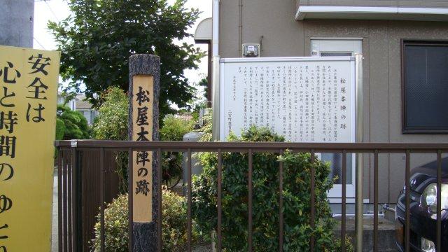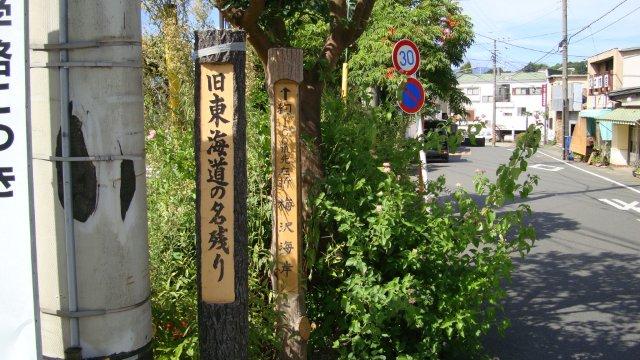 更に進んで、梅沢というところにも「旧東海道の名残り」と記された旧道が残っています。分岐点には「二宮の一里塚」の案内板もあります。日本橋から18番目の一里塚で、大磯宿と小田原宿の中間に位置していました。大磯宿と小田原宿の間の距離が16kmと長い上、この先に押切坂や酒匂川を控えていることから、間の宿(あいのしゅく)として休息所が設けられ、周辺には旅人目当ての多くの茶屋や商店が軒を並べ、「梅沢の立場」と呼ばれて大層賑わっていたとのこと。その中心的存在となっていたのが「松屋本陣」で、参勤交代の諸大名や宮家・幕府の役人などの休息所に指定されていました。とある民家の庭先に「松屋本陣跡」の標柱と案内板が建っていましたが、松屋の末裔に当たられるのでしょうか?