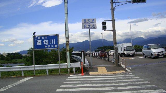 松並木が見事な酒匂歩道橋手前に「日本橋から80km」の標識があります。目指す小田原まではあと5−6kmです。時刻は11時前ですので、昼過ぎには着いてしまいます。小田原名物の蒲鉾で一杯飲んで帰るかと思ったのですが、交通標識に「箱根 11km」と書いてあります。箱根ってそんなに近かったのかな?せっかくなら箱根宿まで行ってみようかという気になります。小田原から先のルートは調べてこなかったのですが、大丈夫でしょうか?中洲が木々に覆われた酒匂川を渡ります。「酒が匂う川」というくらいですから、きっと何かの伝説が残っているに違いないと思って探したのですが、それらしき案内板はありませんでした。「昔々、酒好きのおじいさんが二日酔いを覚まそうと川の水を汲んで飲んだらお酒の匂いがした。。。」なんてことではなく、「大和武尊が東征に際してこの川へ神酒を注いで龍神に祈念したところ、その匂いがしばらく止まらなかった」というのが川の名前の由来だそうです。