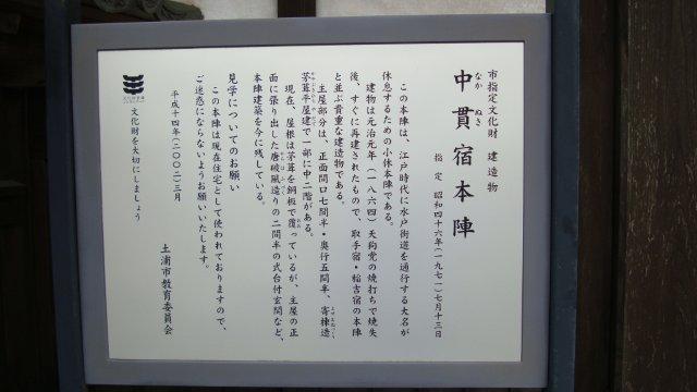 6号バイパス中貫入口交差点先のトンネルをくぐって、日本橋から数えて13番目の中貫宿に入ります。沿道には農家と思しき住宅が多いようですが、その中に立派な門を構えた豪邸があります。門の横には、「中貫宿本陣」と書かれた案内板が建っています。現在でも住居として使われているそうですが、宮殿のような庇をくぐって中に入るのはどんな気分なのでしょうか?