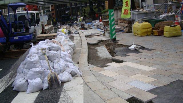 永代通りを日本橋交差点で左折し、日本橋を渡ります。相変わらず橋の工事は続いていますが、今日は歩道を通行止めにして路面に御影石を敷きこんでいるようです。日本橋の車道を歩くのはこれが最初で最後かもしれません。三越向かいに建設中だったコレド室町は既にテナントが入居を始めたようで、お店の前には開店祝いの花輪が並んでいました。老舗が建ち並ぶ中央通りに新しい名所が誕生しましたね。