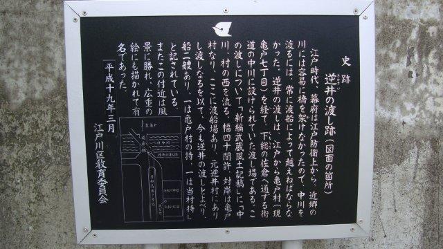 本所といえば、吉良上野介の上屋敷があったところですね。堅川に架かる一之橋(隅田川から数えて最初の橋という意味)は、赤穂浪士が討ち入りの後、泉岳寺に引き上げる際に渡った橋として知られています。五之橋あたりから旧千葉街道の標識が目につきます。案内板によりますと、「旧千葉街道は両国橋から堅川の北岸沿いに東へ通じて千葉方面に至り、江戸時代から佐倉道と称して江戸と千葉方面を結ぶ重要な陸路であった・・・」と書かれていました。前回、千葉街道を歩いた時は五之橋からルートを間違え、旧中川の「逆井の渡し跡」の史跡を見逃しました。今回は事前に確認しておいたおかげで、旧中川に架かる逆井橋に無事辿りつきました。江戸時代、現在の荒川・中川は存在せず、千葉街道は旧中川を逆井の渡しで渡った後、荒川の開削で消滅した四ツ又で行徳街道と交差し、小岩で江戸川を渡って房総に向かったのだそうです。大河のような荒川・中川が存在しなかったとは信じられませんね。