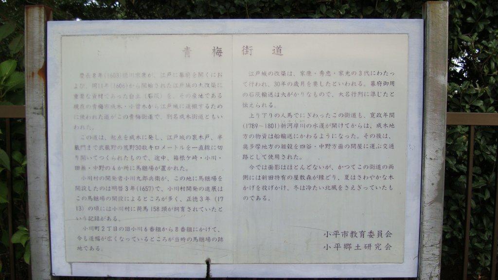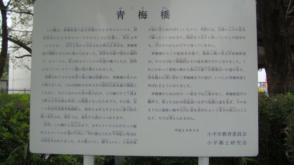 青梅橋交差点で現在の青梅街道(都道5号線)は北に向きを変えています。これは武蔵野を一直線に切り開いた青梅街道のコンセプトと反しますね。そうです、旧青梅街道は青梅橋から西武拝島線の東大和市駅前広場を経て、一直線に延びる江戸街道に重なっているのです(都営村山団地あたりまでは、かっての桜並木に因んで桜街道とも呼ばれています)。地図で見ますと、一目瞭然です。話を戻して、橋の袂に立っていた案内板で青梅橋の由来をまとめてみます。それによりますと、「青梅橋は、青梅街道の起点の四谷から25km、終点の青梅から20kmのところに位置し、承応四年(1655年)に玉川上水から分水された野火止用水を渡るために架けられました。両岸を石組で固め、幅2.5m、長さは4mの木造の橋でした。その後、野火止用水路は暗渠化され、橋も取り壊されました。西武拝島線の駅の名前も当初は青梅橋駅でしたが、東大和市駅に改名され、青梅橋は交差点に名前を残すだけになりました。明治15年頃、青梅橋から丸山台までの4kmにわたって、幅20mの道の中央に一列に植えられた桜並木は千本桜と呼ばれ、その数といい、樹齢といい、小金井堤の桜に劣らぬ素晴らしいもので、桜の季節には近郷の人々が花見に訪れて大層賑わったと云われています。青梅橋からこの桜並木を経て箱根ヶ崎に至る旧青梅街道は今は寂れて断続的にその跡を残すだけになりました。これに代わって、青梅橋から北上し、奈良橋から箱根ヶ崎に至る狭山丘陵下旧集落沿いの道が栄え、いつしか青梅街道と呼ばれるようになりました。青梅橋から丸山台の一つ家までは人家がなく、青梅街道中の難所で、夜ともなれば夜盗追いはぎの危険に道を急ぎ、日のあるうちに箱根ヶ崎や小川に宿を求めたという昔日の旅人のことなど、今では考えられません。」ということです。