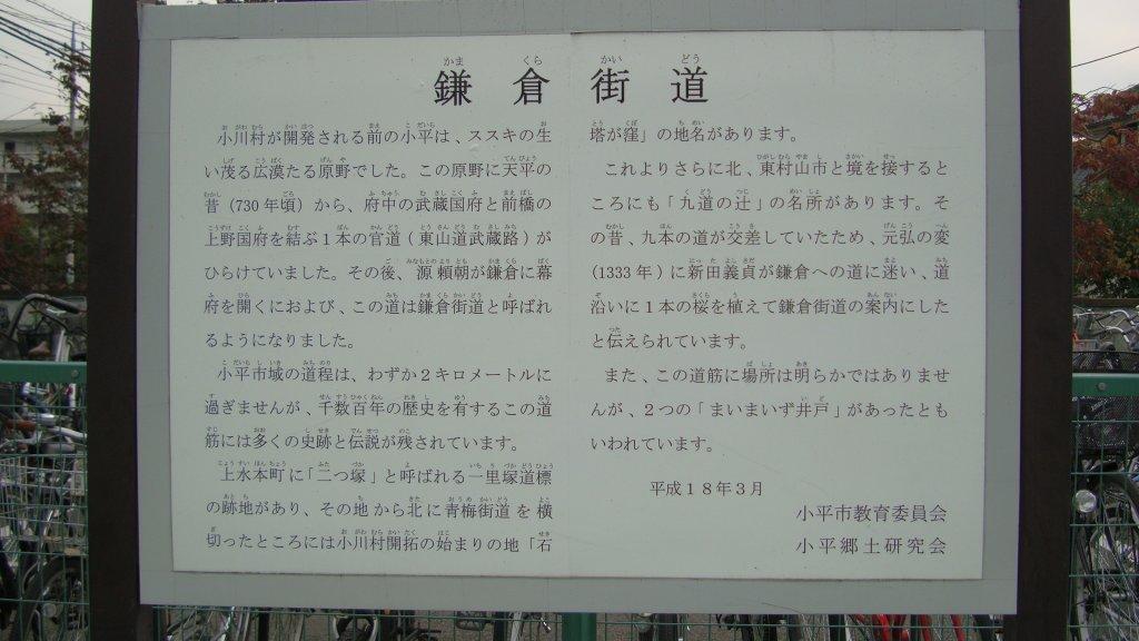 標識と共に、案内板も立っていました。それによりますと、「小川村開拓以前の小平はススキの生い茂る広漠たる原野でした。この原野に天平の昔(730年)頃から、府中の武蔵国府と前橋の上野国府を結ぶ1本の官道がひらけていました。その後、源頼朝が鎌倉に幕府を開くにおよび、この道は鎌倉街道と呼ばれるようになりました。千数百年の歴史を有するこの道筋には多くの史跡や伝説が残っています。そのひとつが、小平市と東村山市の境にある「九道の辻」です。その昔、ここには九本の道が交差していて、元弘の変で新田義貞が鎌倉へ攻め上る際に道に迷い、この道沿いに1本の桜を植えて鎌倉街道の案内にしたと云われています。」とのことです。