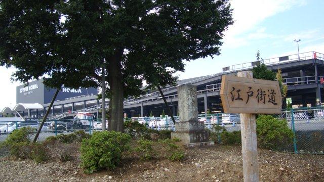 残堀川に架かる伊奈平橋で右折し、手打ちうどんのお店の手前で細い路地に入ります。上砂橋で残堀川を渡った地点は、地図上で榎交差点から一直線上のところにあります。旧道が如何に真っ直ぐに延びていたかが実感できます。グリーンタウン南交差点で右折し、中原公園の手前で左折します。ここから先の区間は旧道が一部途切れていますが、住宅地の路地を抜け、ジョイフル本田の手前に出ます。今まであちこちでジョイフル本田の店舗を見ましたが、とにかくデカイお店です。その敷地の角の盛り土の上に榎(?)の巨木が枝を広げ、隣には古い庚申塔の石碑が建っています。江戸街道の標識も置かれていますので、一里塚か何かの跡なのでしょうか?案内板が欲しいところです。