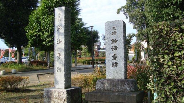 その直ぐ先の公園には鈴法寺跡の石碑が建っています。鈴法寺は虚無僧で有名な普化宗の総本山でした。慶長十八年(1613年)に当地に移転し、全国120ヵ所の総本山として栄えたそうです。公園の奥には歴代寺持の墓が10基ほど残っていますが、深編笠の墓石なのでのっぺらぼうの形をしているのが面白いところです。そういえば、水戸街道を歩いた時に「小金宿」で虚無僧の寺「一月寺」跡を見かけましたね。