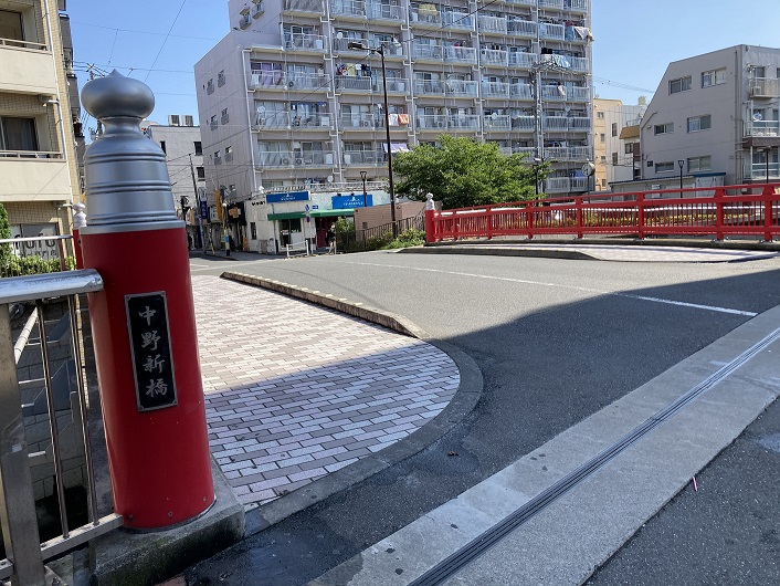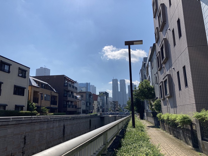 - 今日は梅雨の合間の貴重な晴天です。夏至は過ぎましたが、予報では日照が11時間も見込めるそうです。明日からはまた雨の日が続くみたいですから、今日は先日に引き続き、神田川の後半区間を歩きたいと思います。引き継ぎ地点は中野新橋です。赤い欄干が印象的ですが、ここからは新宿の高層ビル群が望めます。この辺りは距離的に新宿に近いということと、見る方角がちょうど良いということで、都庁のツインタワーの格好の眺望スポットになっています。特に、中野新橋駅に近い川島通りという鄙びた商店街は「都庁がよく見えるスポット」として、観光ガイド本に紹介されています。