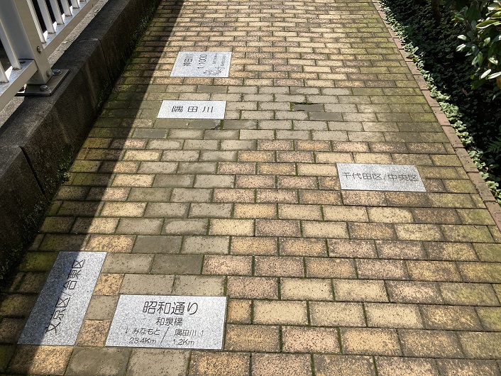 中野新橋から山手通りに向かって神田川の遊歩道(右側)を進みます。レンガ敷の遊歩道には幾つかのプレートが埋め込まれ、源流の井の頭池から隅田川の合流地点までの道のりが主要ポイントと共に表示されています。プレートは神田川の全長である24.6kmの千分の一の縮尺の24.6mの長さにわたって敷かれています。「みなもと 井の頭池」から始まって、「環八通り 佃橋」・「塚山公園 (塚山遺跡)」・「環七通り 方南橋」・「善福寺川」・「中野通り 寿橋」・「現在地 向台小学校」・「山手通り 長者橋」・「落合中央公園 (落合下水処理場)」・「妙正寺川」・「明治通り 高戸橋」・「芭蕉庵 (江戸川公園)」・「目白通り 江戸川橋」・「日本橋川」・「東京ドーム (小石川後楽園)」・「白山通リ 水道橋」・「昭和通り 和泉橋」・「隅田川」まで、神田川の見所と共に各地点の位置が表示されています。面白い発想ですね。