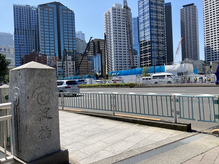 長者橋を渡って神田川の細い側道を進みます。青梅街道と交差するところに架けられたのが淀橋です。税務署通りと二股に分岐する地点の西新宿側一帯は大規模再開発中です。この一画はちょっと前まではビルや住宅が密集していましたが、あっという間に更地になり、今は工事用のクレーンが林立しています。淀橋の名前の由来については中野長者伝説でも紹介しましたが、橋の袂に次のような案内板が立っています。