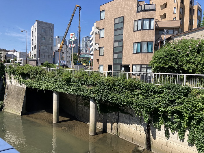 先日桃園川を歩いた際に、神田川との合流点そばに架かる末広橋に開口部がないことに不思議な思いをしました。後で調べてみて、末広橋の下流側に開口部があるとのことが分かりました。今日、実際に確かめてみたら、確かに、末広橋の下流側に大きな口を開けていました。もっとも、今では桃園川暗渠を流れる水は周辺地域の汚水などが集まったもので、通常時は合流地点からは流れ出ず、別の地下管渠で落合水再生センターへ直接送られて下水処理されているそうです。神田川との合流点では、通常流れ出る水はほとんどありません。降雨時などの臨時の出口になっています。