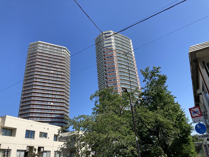 更に進んで中央線の高架下を潜ります。左手には2棟の高層タワーがそびえ立っています。昔は結婚式場で有名だった日本閣の跡地に建つマンションです。30階と31階建てだそうですが、建設当時は東中野エリアに高層ビルが少く、とても目立つ存在でした。
