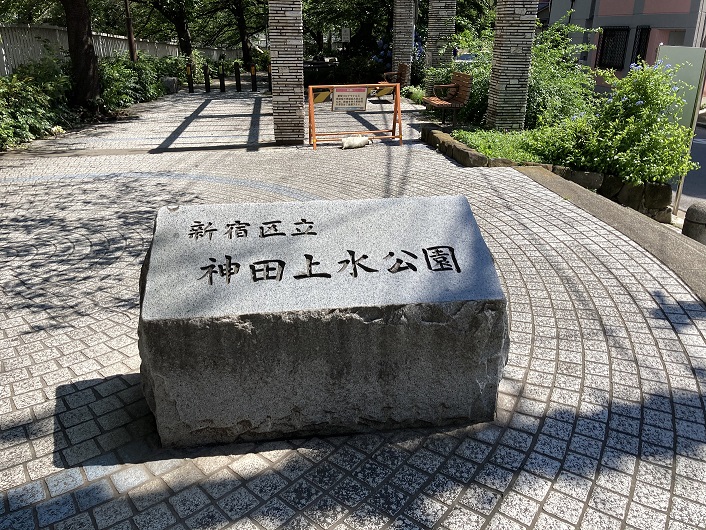 小滝橋の手前に神田上水公園があります。神田川沿いの細長い敷地ですが、植栽とか健康器具とかが充実しています。おや、おばさんが背伸ばしベンチで入念にストレッチをしています。あまり人には見られたくない光景です。新宿区のHPには、「延長約600mのなかに流れや遊具で遊べる空間があります。園内の桜並木はみどりの新宿30選に選ばれており、四季折々に美しいです。」と紹介されています。