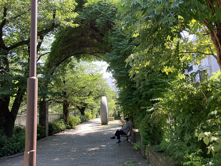 新宿区内の神田川の側道にも小さな植栽のスペースが設けられていて、ところどころに河川をモチーフにした彫像が置かれています。おや、この人形姫にはマスクはかかっていませんね。水の中ではコロナウイルスをガードする必要はないのでしょう。