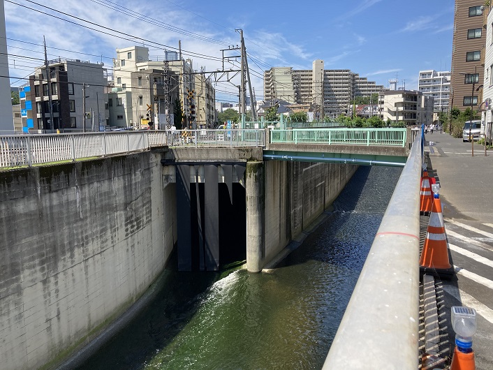落合中央公園の先で神田川は東に大きく方向を変えます。この先、暫くは側道が途切れます。回り道をしようとしたのですが、どう間違えたのか西武新宿線の線路に突き当たってしまいました。仕方がないので、一旦新目白通りに出ます。先日歩いた妙正寺川に架かる辰巳橋の下流側から見ますと高田馬場分水路の出口が見えます。出口にはカーテン状の覆いがかけられています。何なのか、何のためにあるのかは依然として不明です。