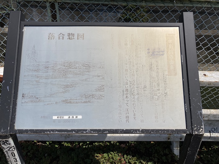 途中で再び西武新宿線を越え、神田川の方に戻ります。東京富士大学のアカデミックな校舎の前を通りますが、側道は未だ再開していません。神田川に架かる田島橋の袂に「落合挿図」という案内板が立っています。