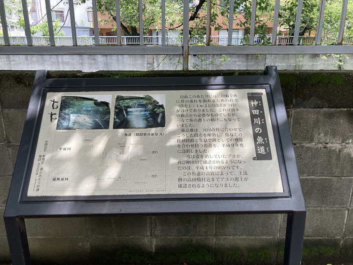 明治通りと都電荒川線(全く馴染まれていないが、愛称は「東京さくらトラム」という)を越え、直ぐ左折して神田川の遊歩道に入ります。「神田川の魚道」なる案内板が立っています。