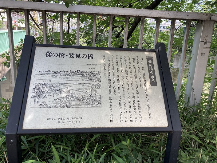 目白台から続く鎌倉街道と推定される古い街道沿いにあり、姿見の橋ともいわれていました。橋の名前の由来には諸説あり、高名な歌人である在原業平が鏡のような水面に姿を映したためという説、鷹狩の鷹をこのあたりで見つけた将軍家光が名付けたという説、近くにいた和田靱負の娘であった於戸姫が数々の起こった悲劇を嘆き、水面に身を投げた時にうたった和歌から名付けられたという説などが知られています。なお、姿見の橋は面影橋(俤の橋)の北側にあるもので、別の橋だという説もあります。
