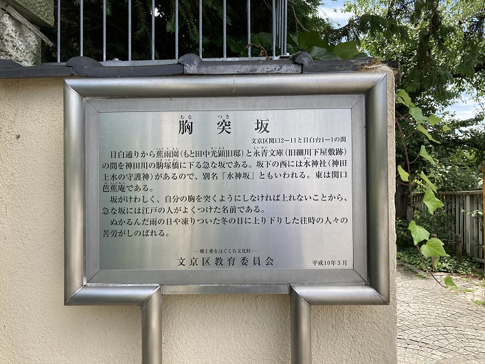 目白通りから蕉雨園(もと田中光顕旧邸)と永青文庫(旧細川下屋敷跡)の間を神田川の駒塚橋に下る急な坂である。坂下の西には水神社(神田上水の守護神)があるので,別名「水神坂」ともいわれる。東は関口芭蕉庵である。坂がけわしく,自分の胸を突くようにしなければ上れないことから,急な坂には江戸の人がよくつけた名前である。ぬかるんだ雨の日や凍りついた冬の日に上り下りした往時の人々の苦労がしのばれる。