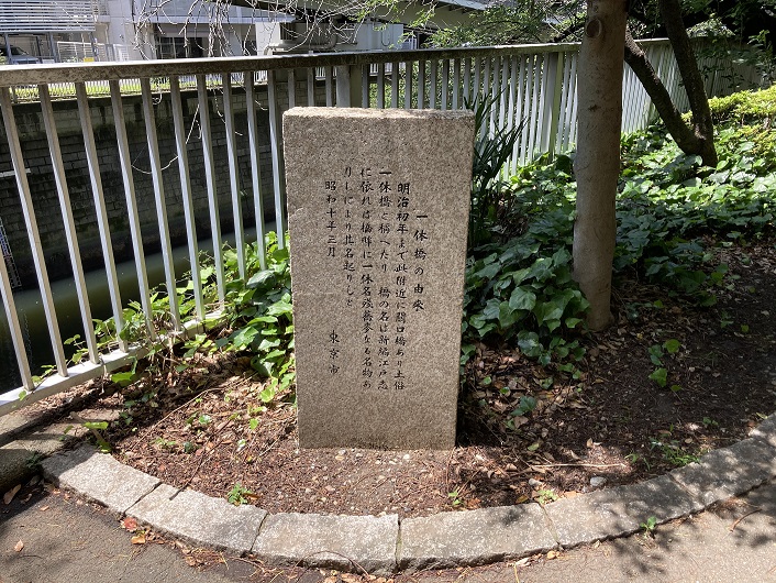 大滝橋のひとつ下流側に一休橋という人道橋が架かっています。幅も狭く、近辺ではひときわこぢんまりした橋ですが、安政年間の江戸切絵図には関口橋の名前でほぼ同じような位置にかかる橋が掲載されています。このころから別名「いっきゅう橋」と呼ばれていたようです。その後、明治時代に周辺の土地の用途の変化などの事情で廃止されましたが、ほぼ同じ附近に復活した現在の橋にもこの名前が受け継がれています。ちなみに「一休さん」とは関係はなく、左岸の川沿いに「一橋殿の抱屋敷」があったことから俗称「いっきょう橋」、それが変化して「いっきゅう橋」となったといわれています。なんだ。。。