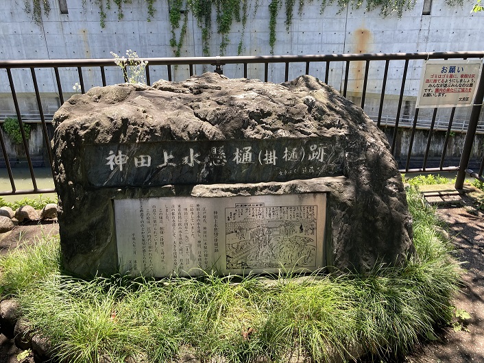 更に更に、「神田上水懸桶(掛桶)跡」なる石碑もありました。石碑の右半分には当時の様子が描かれています。