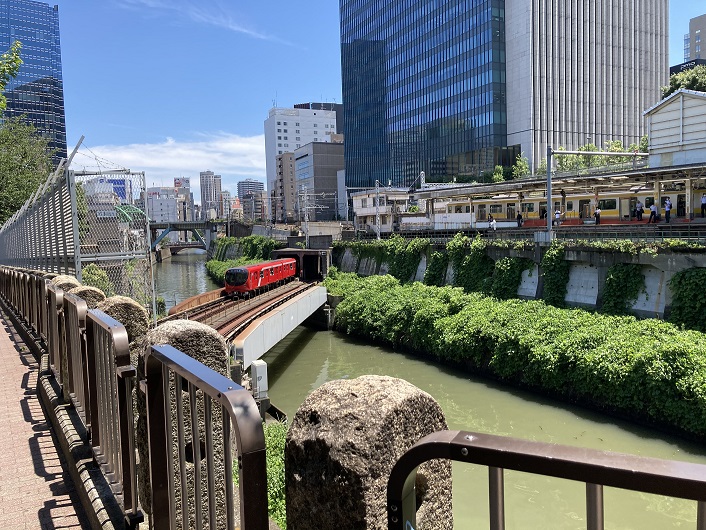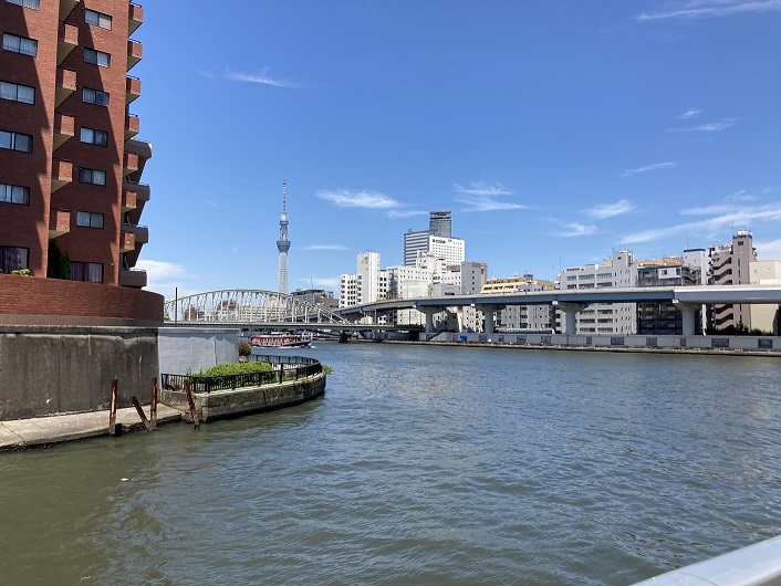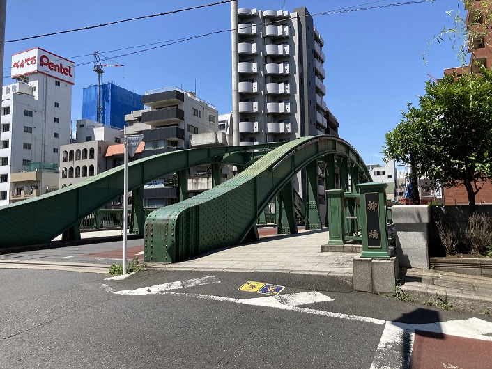 ようやく隅田川の合流地点である柳橋に辿り着きました。柳橋は永代橋のデザインをモデルとし、耐震構造に配慮した鋼鉄橋で建設されています。この位置に初めて橋が架かったのは、元禄11年(1698年)のことで、「川口出口之橋」あるいは近くに幕府の矢の倉があったことから「矢の倉橋」と呼ばれていました。「柳橋」と由来については、