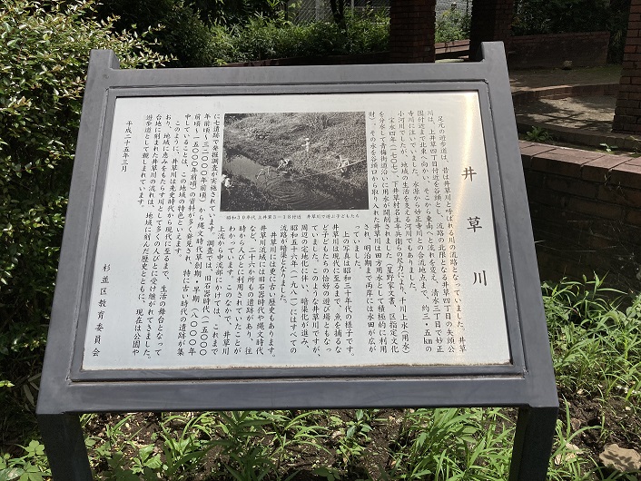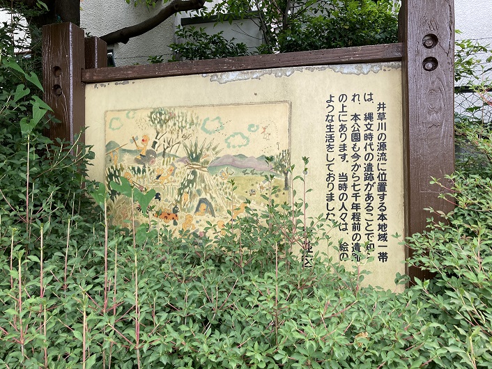 井草川流域には旧石器時代や縄文時代の遺跡があり、太古の昔から人びとに利用されていたことが発掘調査などから分かっています。公園の片隅に次のような案内板がありました。