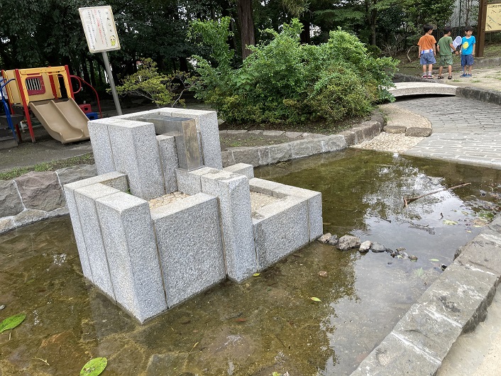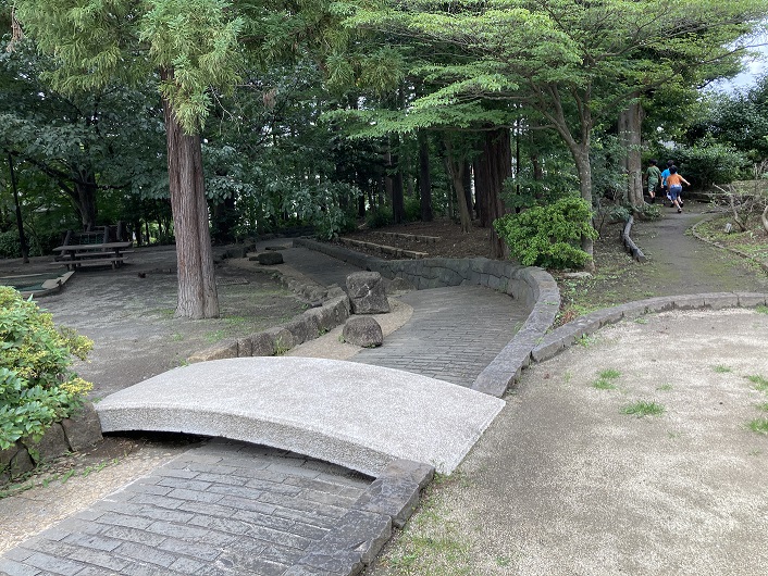 流路は傾斜を下って公園の外に続いています。ここは谷頭(こくとう:谷の最上流部)と呼ばれていたそうですが、なるほどと思わせる地形です。
