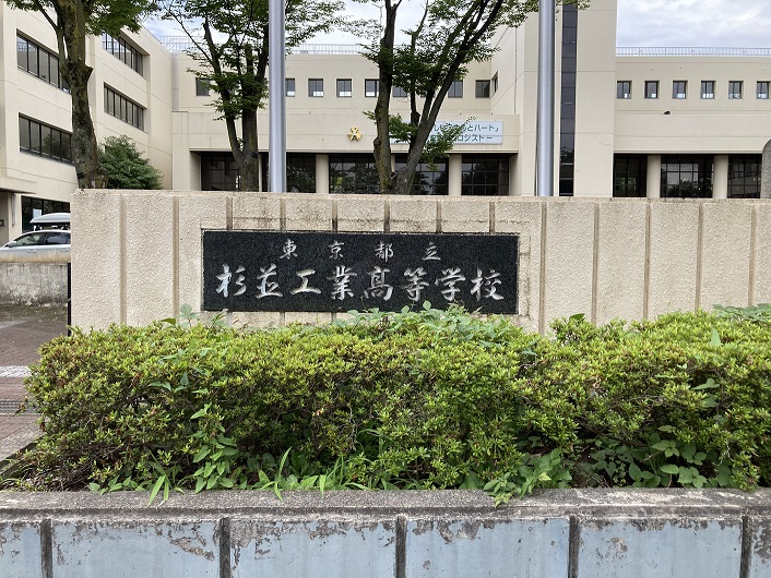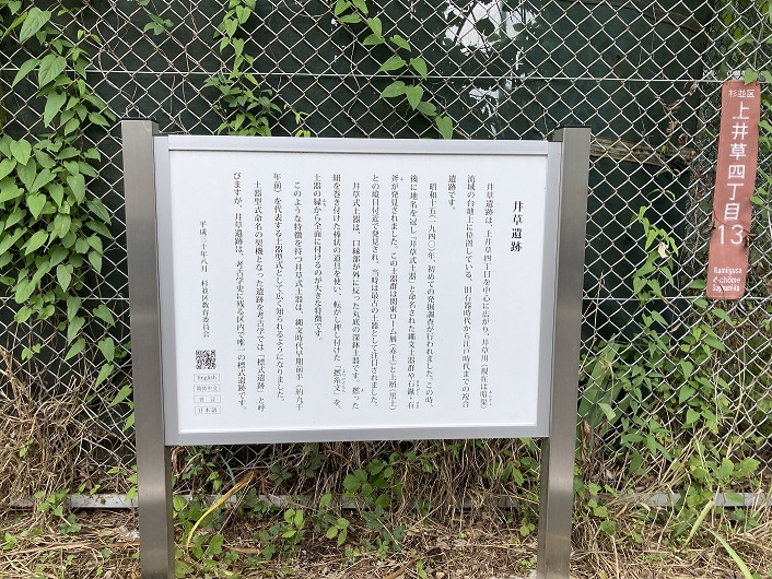 流路に沿って公園の外に出ましたら、道路を挟んだ反対側は杉並工業高等学校の裏手になっています。ここは昔水田が広がっていたとのことですが、所有者の名前からとった「西山田んぼ」を都が買い取って杉並工業高等学校を建てたのだそうです。敷地のフェンス前に井草遺跡の案内板がありました。