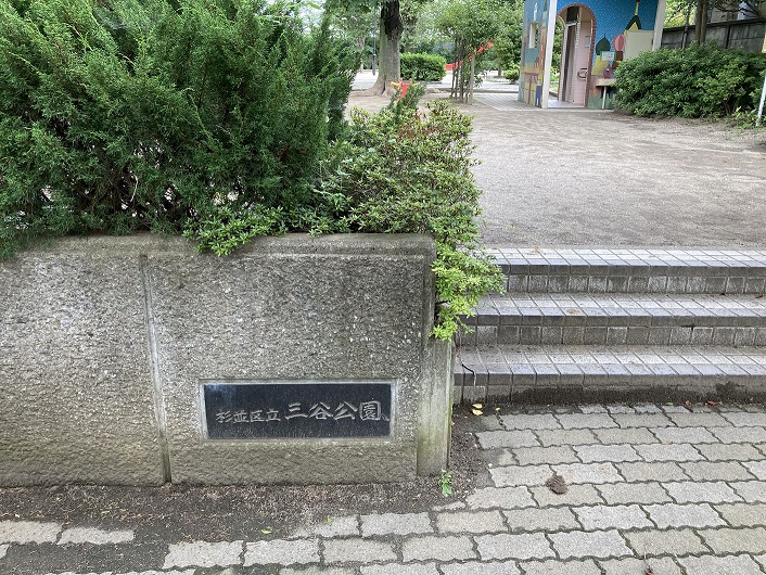 仕方がないので迂回して高校の正門前に出ましたら、道路を挟んだ反対側に三谷(さんや)公園が見えました。三谷公園は切通し公園からの2本の流れと、井草川最上流部とされる原窪支流を合わせた3本の流れが合流し、井草川として1本にまとまって妙正寺池目指して流れてゆく、いわば井草川源流部の結節点とも言える場所です。切り通し公園と三谷公園は、間に杉並工業高校を挟み直線距離で200メートル強で、この僅かなエリアに源流部3本の支流がが絡み合っています。とすると、先ほど行き止まりになった路地は3本の支流の中のひとつの流路だったのかもしれません。