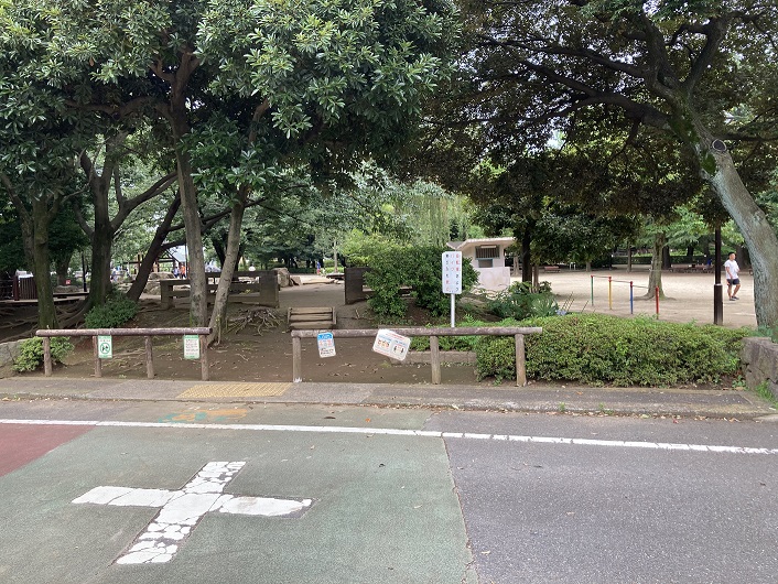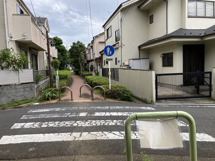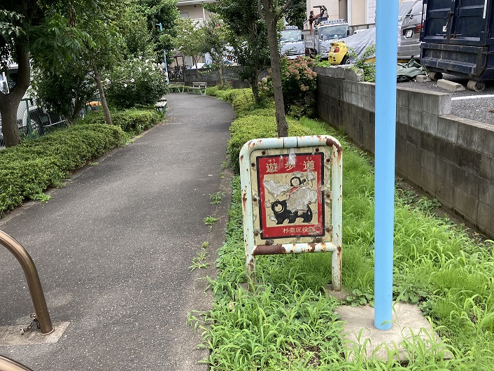 遊歩道ですから車の乗り入れはできません(自転車の通行も禁止です)。杉並区では、このような遊歩道の入口に車の進入禁止を表す金太郎の標識を設置しています。今では金太郎の標識の数が少なくなっているとのことですので、見つけたらラッキーと思っていいでしょう。