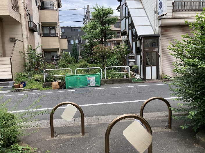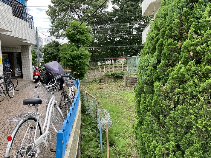 井草川はその田んぼの真ん中を流れていたらしく、暗渠化された今でも流路が杉並工業高等学校の敷地内を通っているそうです。高校の敷地には入れませんので、隣接する民家との間の細い路地を進むことにします。すると、路地にはところどころに下水口のマンホールが見えます。ここに暗渠化された井草川が通っているのかなと思ったのですが、途中で行き止まりになって確かめられませんでした。