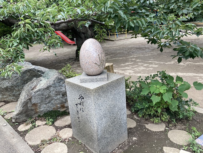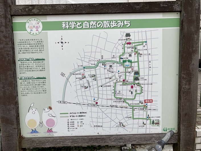 井草川は井荻駅前で環八と交差します。陸橋の反対側に回りますと、再び緑道が再開します。緑道の何カ所かに案内板と玉子を載せた石柱のモニュメントが置かれています。案内板には次のように書かれていました。