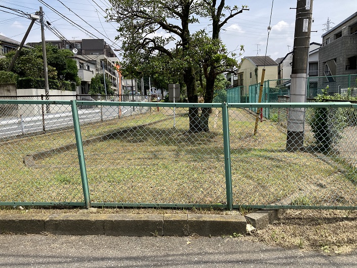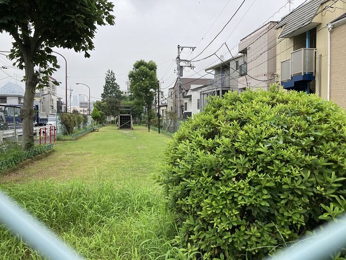 念のために近くを確かめてみたのですが、遊び場96番という名前の公園の中に、いかにも川の始まりといった形状の窪地がありました。窪地がどこまで続いているのか確かめようと公園の端まで歩いてみたのですが、窪地の途切れた先が和泉川の暗渠道とかなり離れていたので無関係と判断しました。