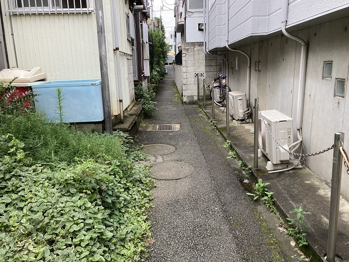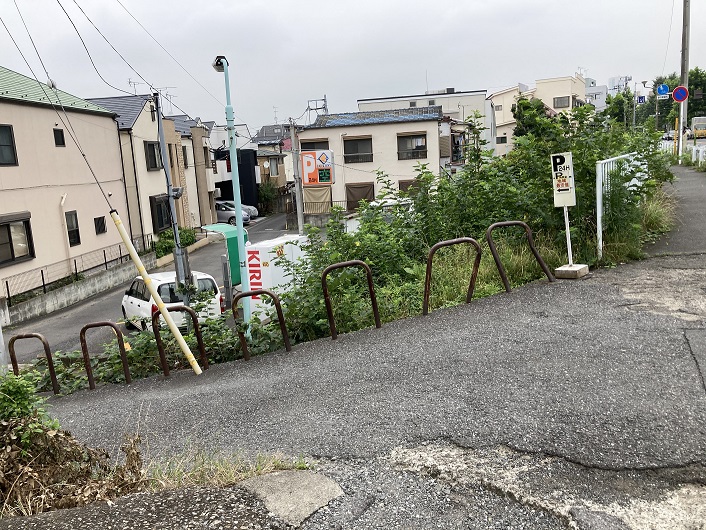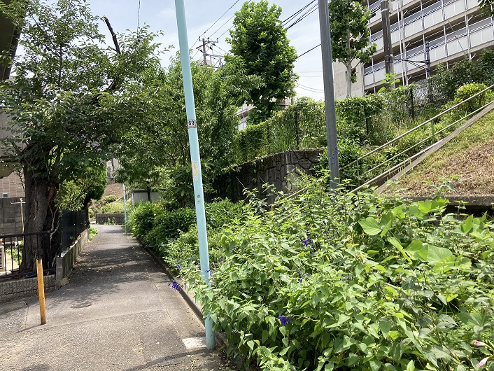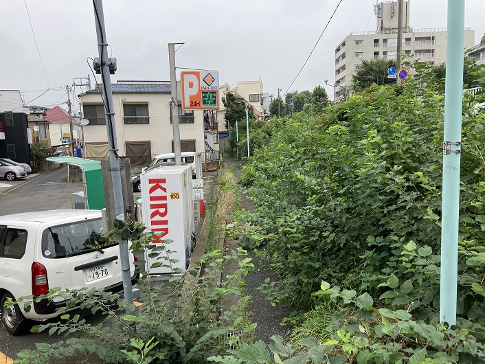 笹塚二丁目交差点の手前で、公園下から始まっていた小道から水道道路へとつながる上り坂があります。坂を上って水道道路を横断すると、反対側にも下り坂があり、道幅は極狭ですが雑草に覆われた暗渠道が延びています。夏草の生長は早く、葉っぱをどけながら進みます。