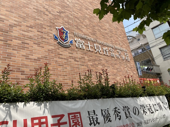 住宅地の中の暗渠道を進んでいきますと、小さな通りに出て、その先が行き止まりになっています。仕方がないので一旦水道道路に出て反対側に回ることにします。水道道路に面して富士見丘中学校・高等学校の校舎が聳えています。ヨーロッパ公国の国章を連想させるかっこいい校章ですね。
