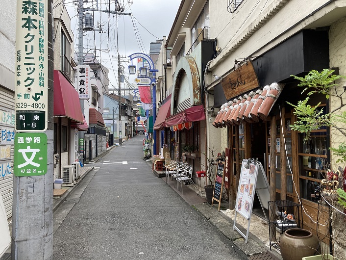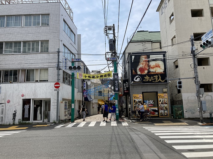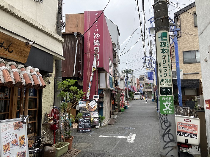 住宅地の中を通る暗渠道を環七方向に進んでいましたら、和泉明店街(明店?)という小さな商店街を横切りました。沖縄風の派手な装飾の居酒屋を見かけましたが、沖縄の名産物を売る商店や飲食店が立ち並ぶ沖縄タウンとして有名な商店街です。元々はどこにでもある普通の商店街でしたが、寂れた商店街を活性化するために、「沖縄」を町興しのテーマとして平成17年にオープンしたそうです。