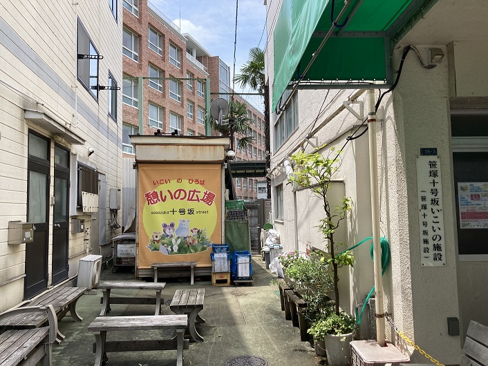 富士見丘高校前交差点を左折して十号坂STREET商店街に入ります。こちらも笹塚駅から北に延びている十号通り商店街になりますが、水道道路を挟んで南側はお店が多いのですが、北側はやや少なめです。交差点から十号坂を少し下った先で、先ほど行き止まりになった暗渠道が再開します。