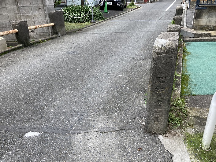 暗渠道に残っている橋の石柱にも新旧があります。古い石柱は当時のまま、真新しい石柱は遊歩道を造った際にモニュメントして新たに置かれたのでしょう。