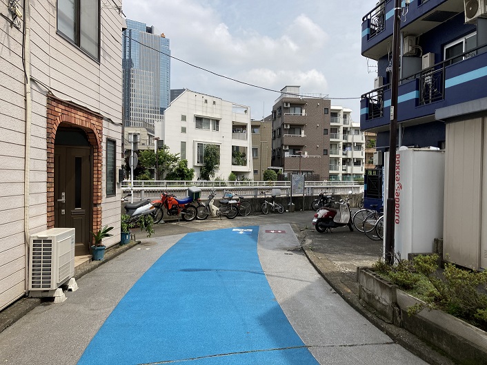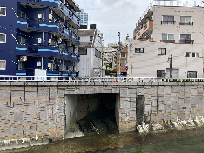住宅地の路地を巡っていた暗渠道はいつの間にか幅を広げてビルの谷間を通ります。