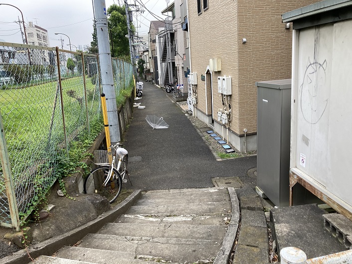 水道道路の南側には、階段を降りて進む小道と水道道路と同じ高さの緑地公園が平行して延びています。江戸時代には環七も水道道路もなかったですから、源泉から来た和泉川の流れがどちらに接続していたのかは分かりません。ただ、水道道路を造ったときに和泉川の流れまでは変えなかった筈ですから、公園下の小道を流れていたのではないかと思います。