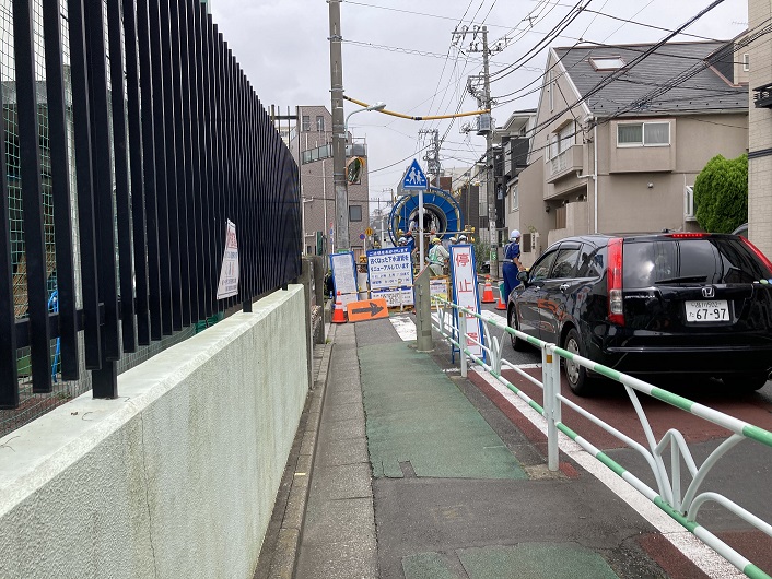 中野通りを渡った先で一般道を進み、中幡小学校の前を通ります。中幡小学校に面した歩道では古くなった下水道管のリニューアル工事が行なわれていました。恐らく、和泉川の暗渠の工事でしょう。