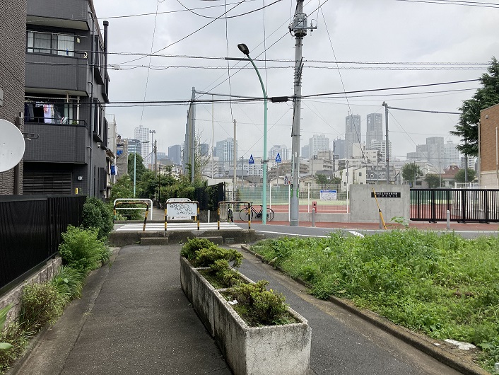 遊歩道に面して真新しい建物の学校があります。渋谷本町学園というので私立の学校かと思ったら、渋谷区内唯一の小中一貫校だそうです。校庭が広く遮るものがないので、ここからの新宿の高層ビル街の眺めは絶景です。