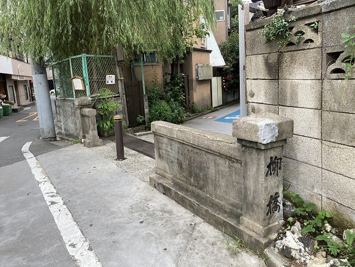 方南通りを渡った先は再び住宅地の中を進みます。ここは完全な遊歩道になっていて、つい最近までは路上に遊具が置いてあったのだそうです。柳橋が架かっていたところに、一本の柳の木が枝を広げていました。ここは、はっぴいえんどのファーストアルバムのジャケットに写った「ゆでめん風間商店」の撮影地にもなったところです。ちなみに、はっぴいえんどは日本のフォークロック・バンドで、細野晴臣、大瀧詠一、松本隆、鈴木茂らがメンバーでした。