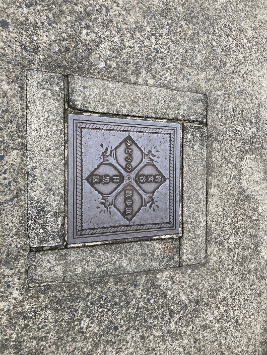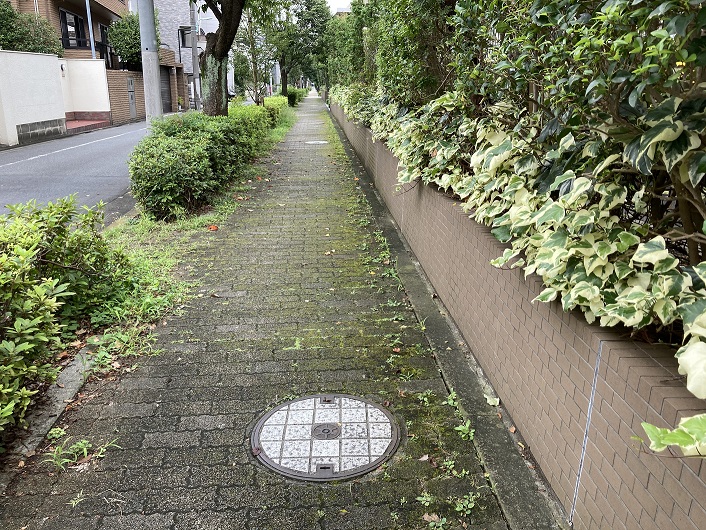 みどりの散歩道のコース設定はこの先で立会川の流れから外れ、右折してすずめのお宿に向かうようになっています。どっちに進むか迷ったのですが、今日は立会川の歩きに徹することにして、右折せずこのまま進みます。真っ直ぐに延びた歩道にはマンホールの蓋が整然と並んでいます。