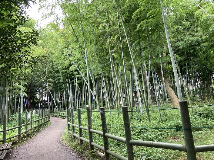都心で竹林を見ることは滅多にありませんが、ここの竹林は本数といい、大きさといい、素晴らしいです。竹林の奥には古民家が保存されています。中には入りませんでしたが、広々とした豪邸です。こんなに部屋数があって一人暮らしであればお掃除が大変だったでしょう。ところで、この公園の中に立会川の源泉になりそうなところはないか探してみましたが、それらしき場所は見つかりませんでした。ただ、公園が周囲よりも小高くなっているので、雨が降ればそれがまとまって川の流れの源になる可能性は十分にあり得ます。