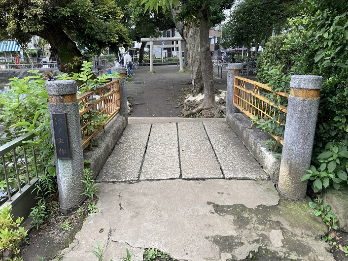 公園の奥には弁財天を祀った祠があり、その手前には池の上橋が架かっています。更に手前には鳥居があり、碑文谷池と全く同じ構図になっています。