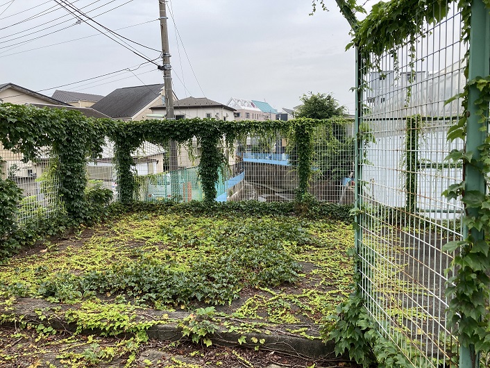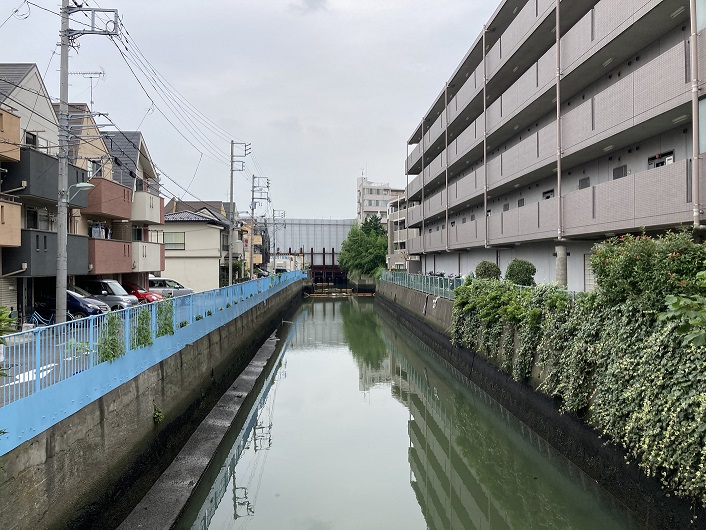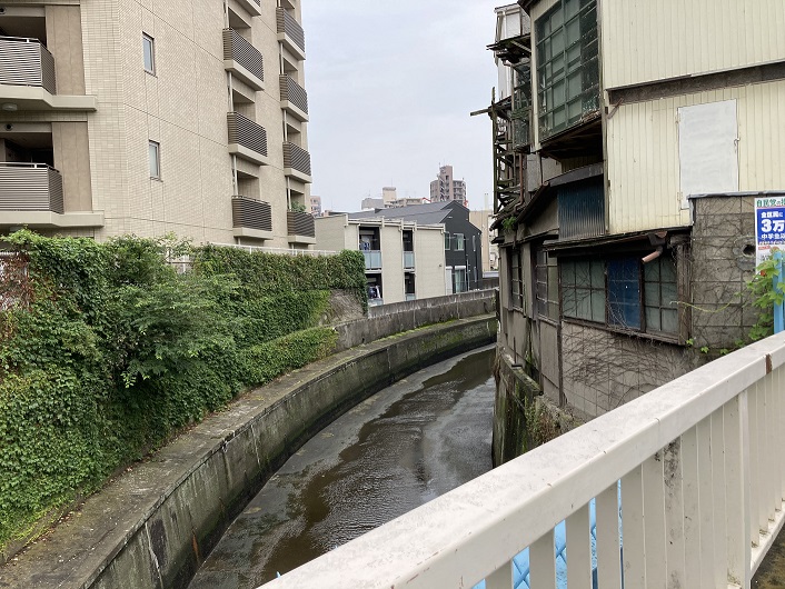緑道が途切れると、立会川は暗渠から開放されます。開口部から先はコンクリート護岸になっていて、この日はほんの少し水が流れていました。この先は住宅が密集していて、川沿いに歩くことは難しくなります。