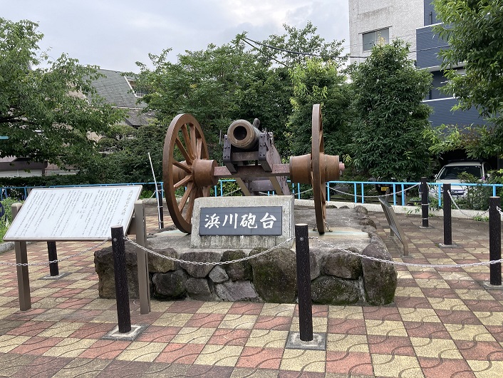 嘉永6年(1853年)6月、アメリカ合衆国はペリー提督の率いる4艘の艦隊を日本に派遣して 開国を迫った。国書を幕府に渡すと、来春、再来航するとしてペリーは去った。日本側は、次回は戦争になると想定して、江戸湾の防備に力を入れることになる。土佐藩はここに鮫洲抱屋敷を持っていたので、砲台を造ることを幕府に願い出た。嘉永7年(1854年)1月、ペリー艦隊が再来航した時、急遽、土佐藩が造ったのが浜川砲台である。6貫目ホーイッスル砲1門(復元)、1貫目ホーイッスル砲2門、鉄製5貫目砲5門、計8門を配備した砲台だった。ここに復元したのは6貫目ホーイッスル砲である。実物のない他藩では丸太を大砲らしく見せた偽物もあった中で土佐藩の装備は江戸っ子の評判も上々で、次のような 狂歌も作られている。