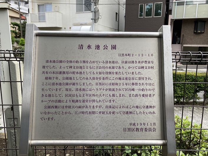 円融寺の前まで戻り、更に緑道を進みます。向原小学校の角で緑道から離れ、立会川のもう一つの水源になっている清水池に向かいます。緩やかにカーブした道路を歩いて行くと、道筋が何となく川の流路を思わせます。目黒七中の先に清水池公園が見えます。清水池は碑文谷池に比べると少し小ぶりながら、そこそこ大きな池です。池の周囲には大勢の太公望が釣り糸を垂れています。公園の入口の石壁には沿革を記したプレートがはめ込まれています。随分と古めかしい文章です。