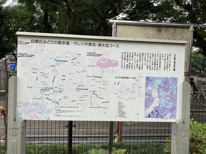同じような内容ですが、「目黒区みどりの散歩道 サレジオ教会・清水池コース」の案内板もありました。