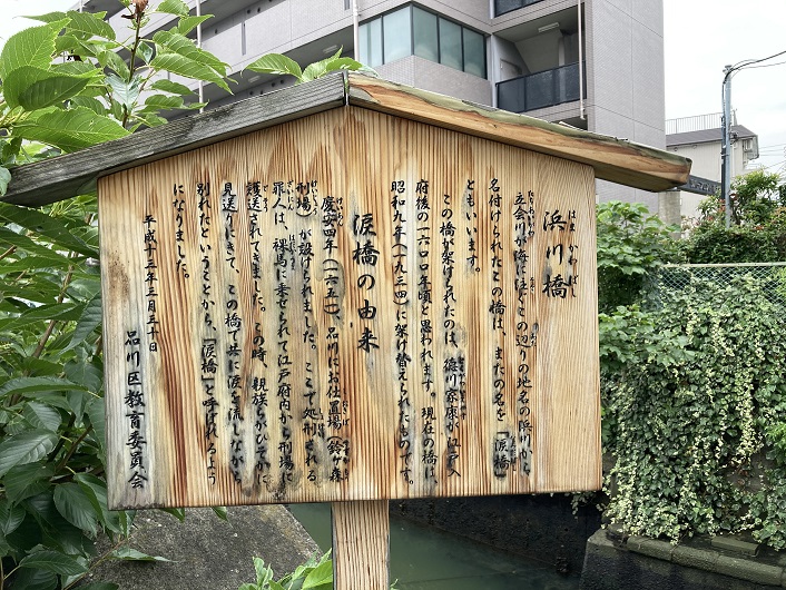 立会川が海に注ぐこの辺りの地名の浜川から名付けられたこの橋は、またの名を「涙橋」(なみだばし)ともいいます。この橋が架けられたのは、徳川家康が江戸入府後の1600年頃と思われす。現在の橋は、昭和9年(1934年)に架け替えられたものです。
